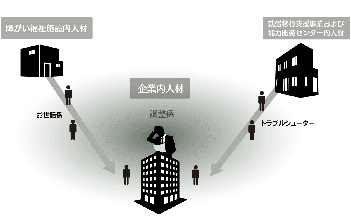 現状のJOBコーチ人材は、【障がい福祉施設内人材】、【就労移行支援事業および能力開発センター内人材】、【企業内人材】の三つに分類されます。主な役割を端的に言い換えれば、障がい福祉施設内人材はお世話係、就労移行支援事業および能力開発センター内人材はトラブルシューター、企業内人材は調整係といえますが、実情は調整係が間に合わず、外部の人材が企業へ一時的に常駐しJOBコーチを実施しているケースが殆どです。